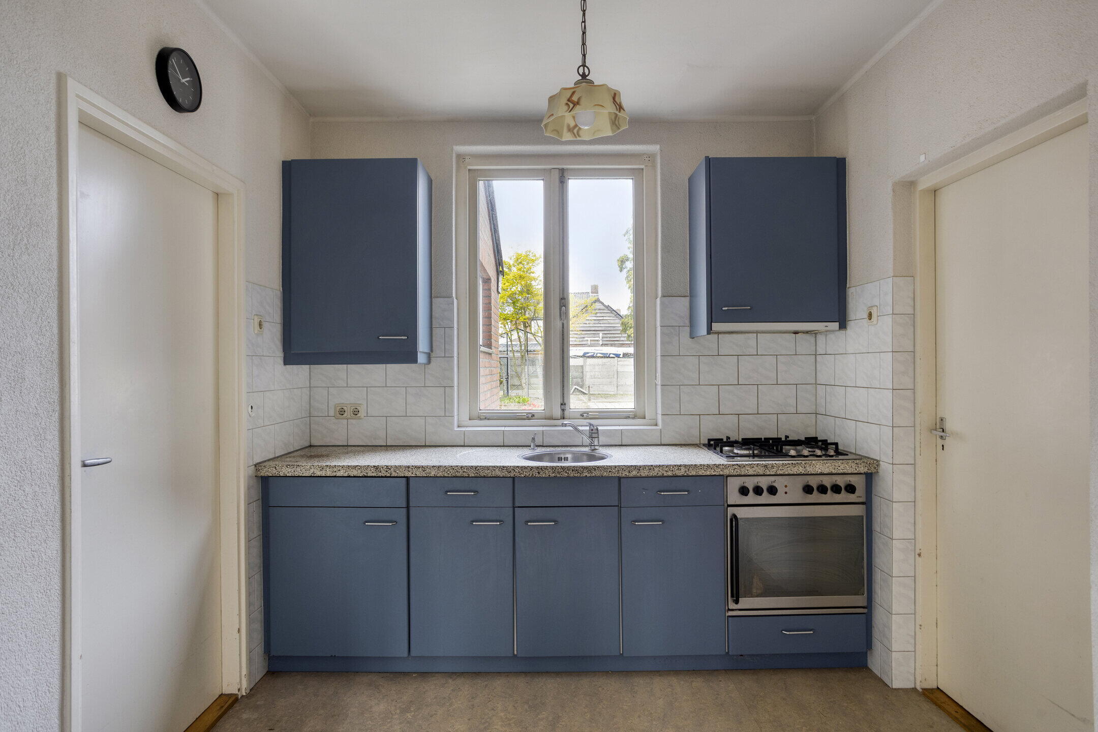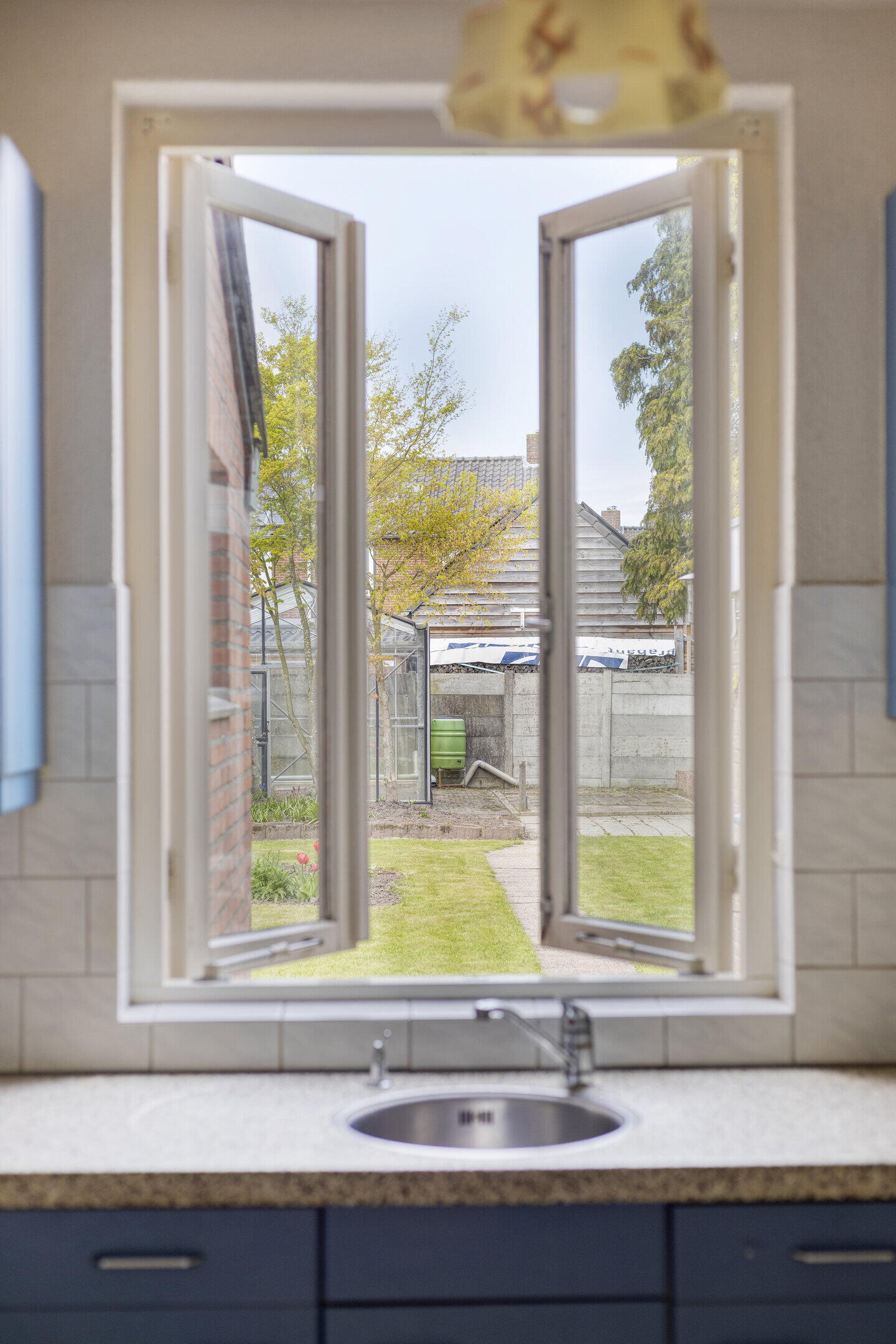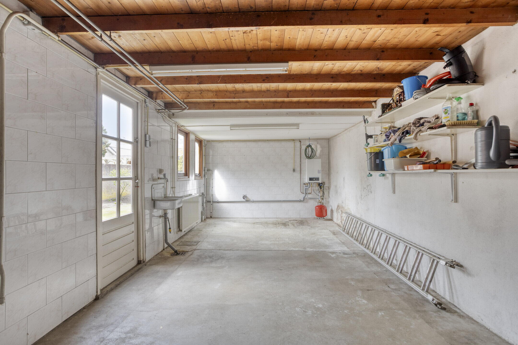Via de hal met toilet en trapopgang bereik je de uitgebouwde woonkamer (2000). Dankzij de uitbouw is er een fijne leefruimte ontstaan met zicht op de diepe achtertuin. De dichte keuken bevindt zich aan de achterzijde en biedt toegang tot zowel de hal als de binnendoor bereikbare garage – ideaal om je woonruimte uit te breiden of voor opslag, hobbyruimte of het stallen van een auto/motor.
